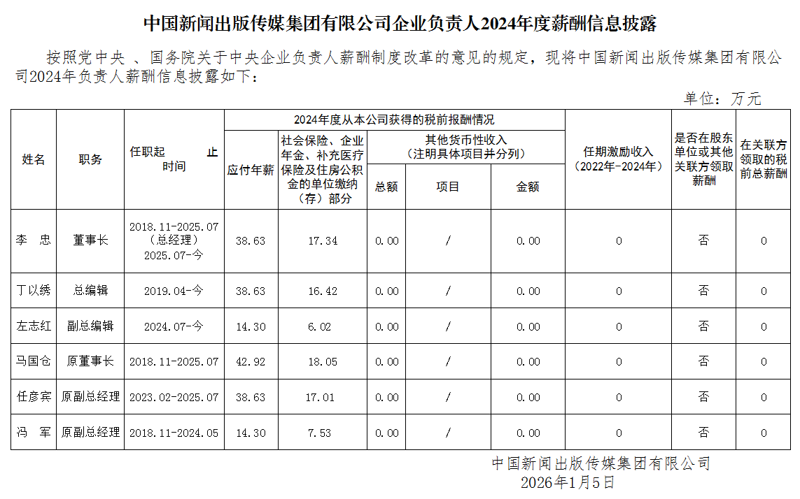 中国新闻出版传媒集团有限公司企业负责人2024年度薪酬信息披露
