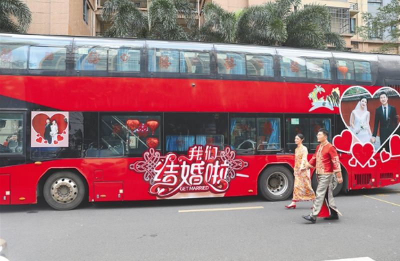 在海口市,关注大巴车当婚车的年轻人并不在少数。“每周我们都会接到咨询电话,我们会预留专门车辆运营婚车业务,有双层观光巴士也有常规大巴。”海口交投集团公交运营分公司运营部工作人员李国安介绍,大巴车作为婚车使用,符合绿色出行的环保理念。婚车的车身和内部可以根据新人要求进行个性化定制。婚车使用当天,公司会安排一名驾驶员和一名管理人员全程陪同,做好相关后勤保障服务。