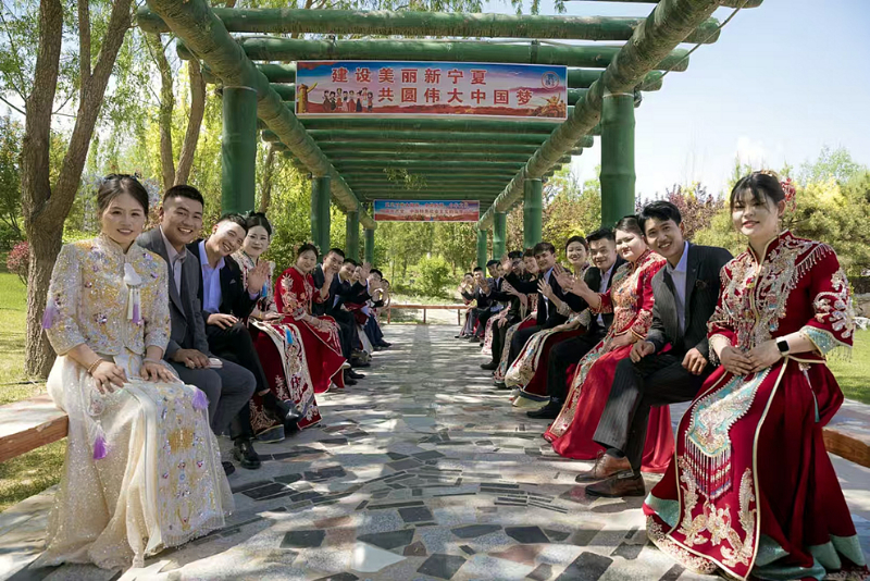 在银川市金凤区,9对新人在贺兰山的见证下,以大自然为媒,许下相守一生的誓言。宁夏文明网供图