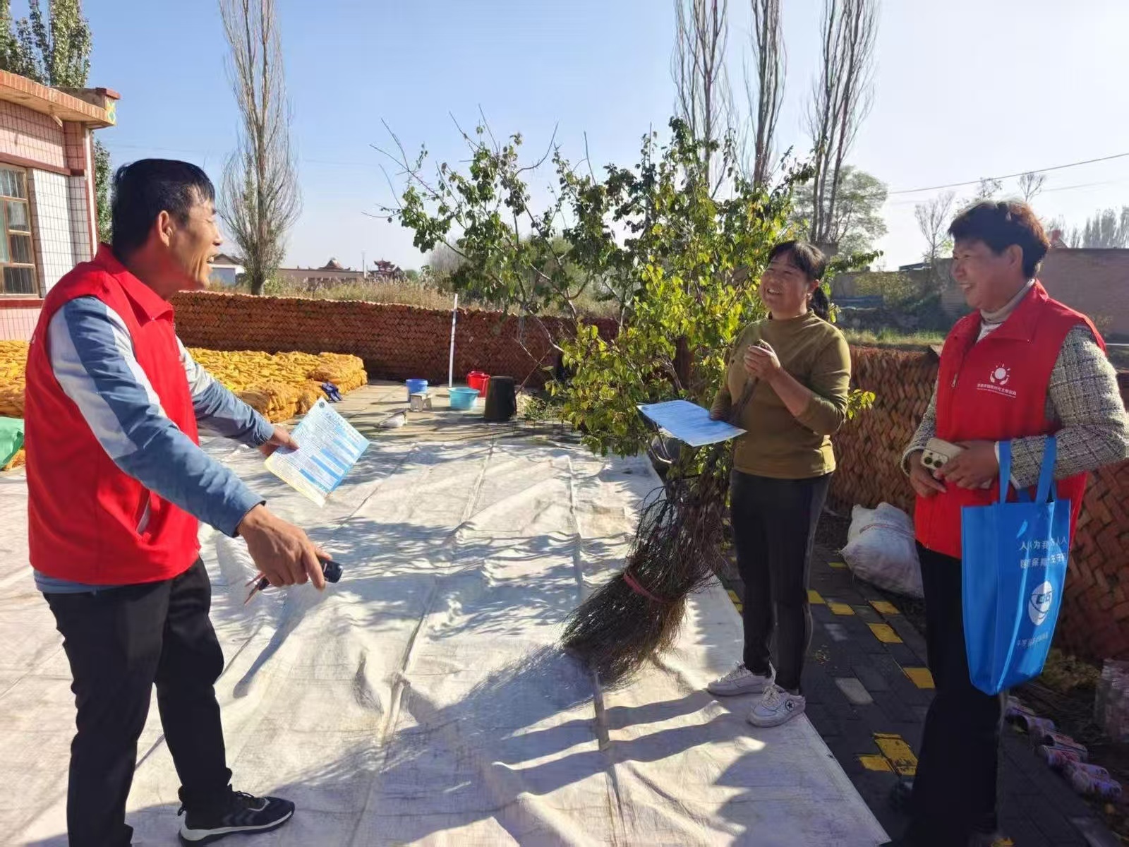 宁夏石嘴山市平罗县黄渠桥镇红光村党支部书记马学明(左)向村民宣传低价彩礼。图片来源:宁夏日报