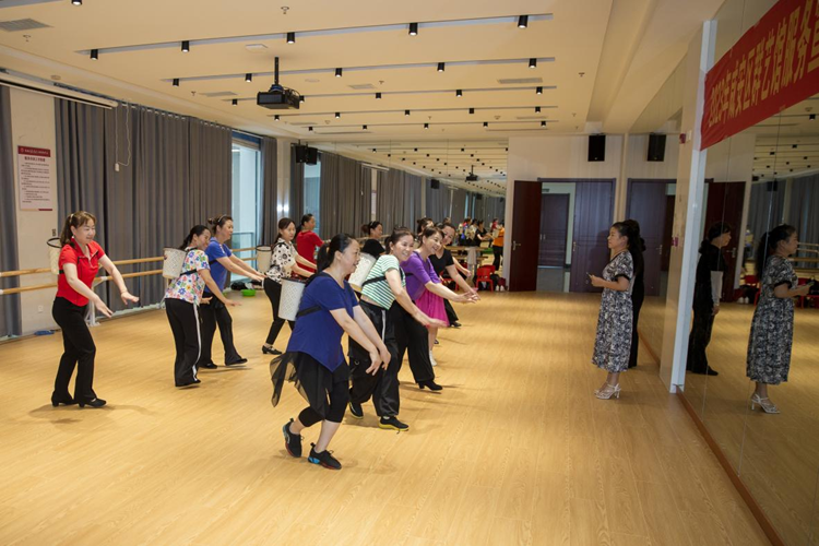 7月22日,正在湖北省咸宁市咸安区新时代文明实践中心里排练舞蹈的市民。新华网 钟奕 摄