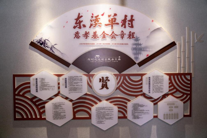 8月30日,浙江省台州市临海市东溪单村乡贤馆展示的慈孝基金会章程。据了解,早在2011年东溪单村就筹资成立专门用于弘扬和传承孝道文化的村级孝心基金会。新华网 钟奕 摄