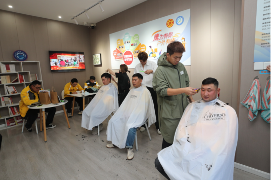 11月21日,南通市崇川区江海志愿服务驿站(圆融商圈站)启用“小蜜蜂”加油站,为新业态新就业群体提供24小时“不打烊”的志愿服务。这是周边商铺志愿者在此提供公益义剪服务。新华网发(江建华 摄)