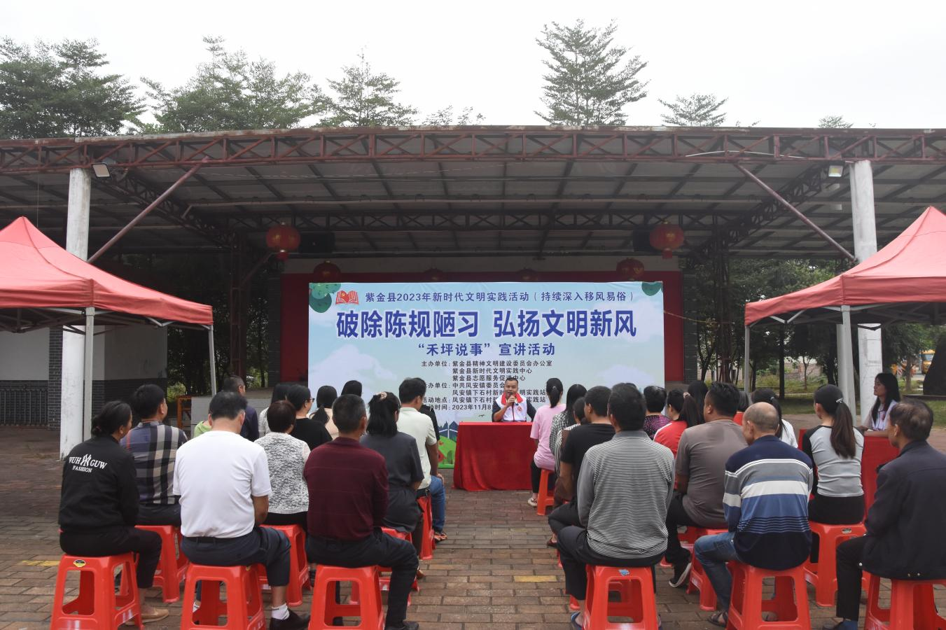 凤安镇回龙村在家门口的禾坪开展移风易俗宣讲活动。