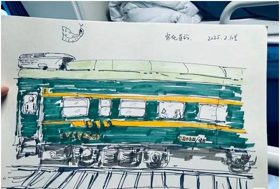 乘客画笔下的绿皮火车。