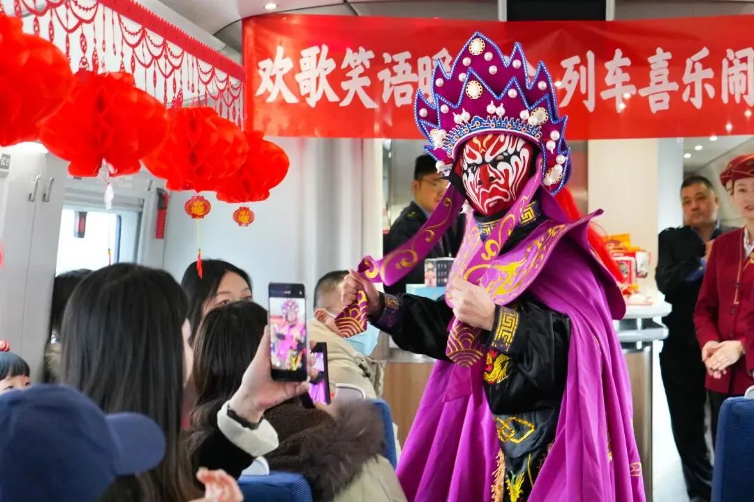 旅客在高铁列车上看变脸表演。