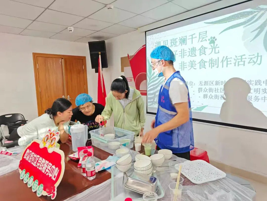9月25日,天涯区实践中心联合群众街社区实践站开展非遗美食斑斓千层制作活动。